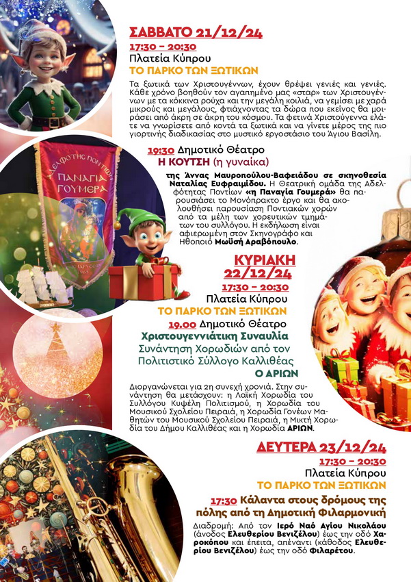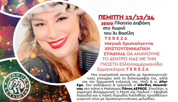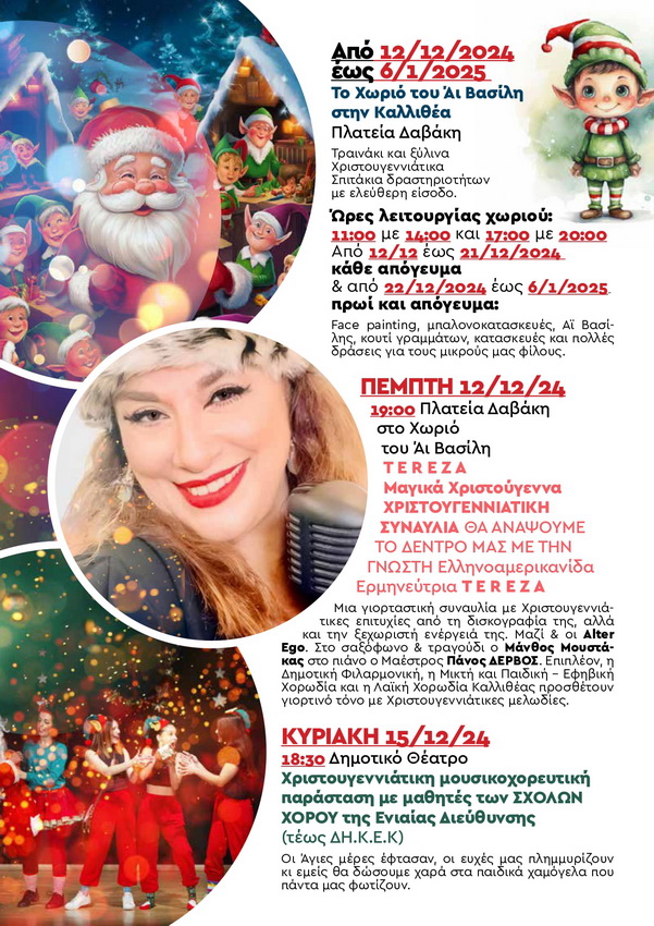 Ο Δήμος Καλλιθέας υποδέχεται τα Χριστούγεννα με ένα πλούσιο πρόγραμμα που ταξιδέψει μικρούς και μεγάλους. Η έναρξη θα γίνει την Πέμπτη 12 Δεκεμβρίου στις 19.00 το απόγευμα τότε Ανάβουμε το Χριστουγεννιάτικο Δέντρο της πόλης μας στο «Χωριό του Άι Βασίλη» στην πλατεία Δαβάκη. Η βραδιά θα πλαισιωθεί με μια Χριστουγεννιάτικη συναυλία από την τραγουδίστρια T E R E Z A Μαζί οι Alter Ego, η Δημοτική φιλαρμονική, η Μικτή και Παιδική – Εφηβική χορωδία και την Λαική Χορωδία θα αρχίσουν να προσθέτουν γιορτινό τόνο με χριστουγεννιάτικες μελωδίες. Οι εκδηλώσεις θα συνεχιστούν μέχρι τις 5 Ιανουαρίου.