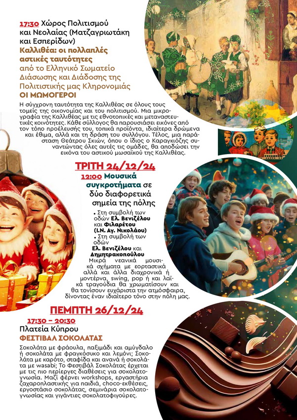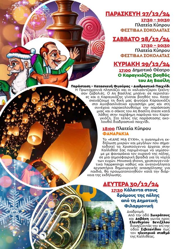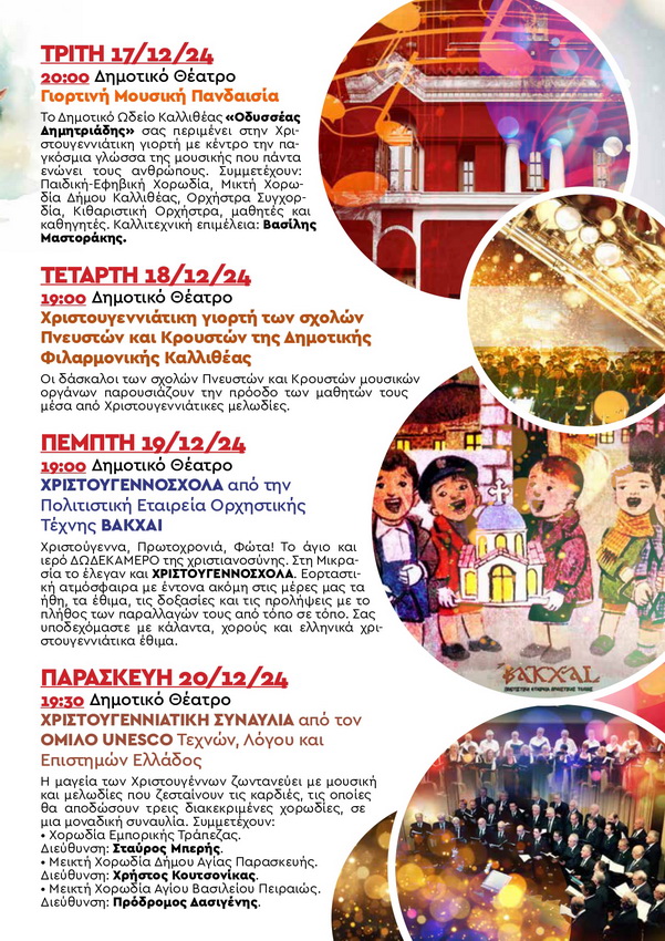“Καλλιθεάτισσες, Καλλιθεάτες. Με ιδιαίτερη χαρά σας καλοσωρίζουμε στην φετινή εορταστική περίοδο, η οποία γεμίζει την πόλη μας με φως,χαρά και αισιοδοξία. Ο Δήμος Καλλιθέας, όπως κάθε χρόνο, έχει ετοιμάσει ένα πλούσιο πρόγραμμα Χριστουγεννιάτικων εκδηλώσεων και δραστηριοτήτων που απευθύνονται σε μικρούς και μεγάλους. Σας καλούμε όλους να συμμετέχετε στις εκδηλώσεις μας, να γίνετε μέρος αυτης της μεγάλης γιορτής, που στόχο έχει να γεμίσει τις καρδιές μας με ελπίδα και ζεστασιά.