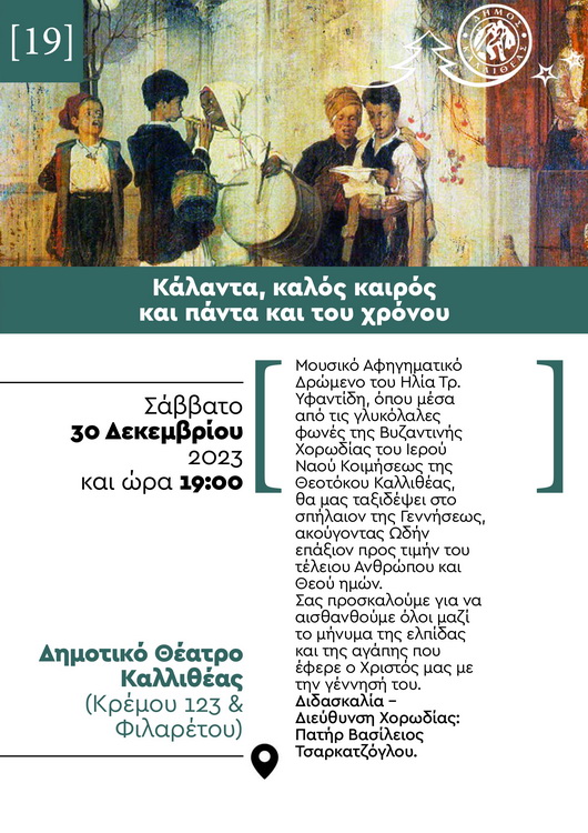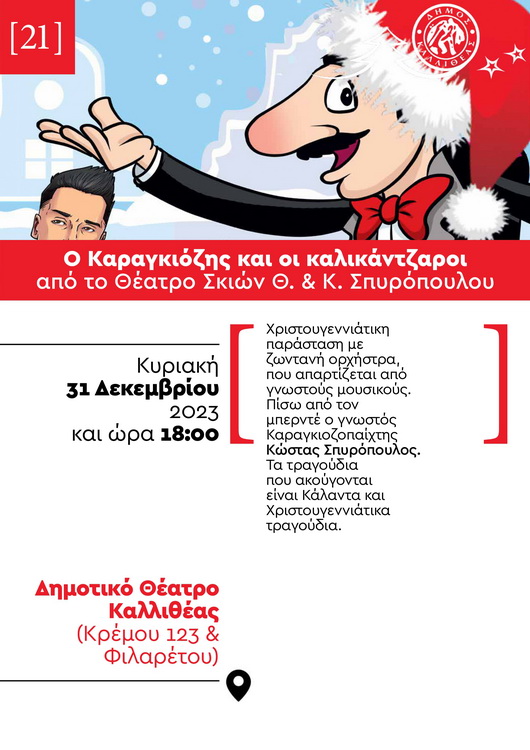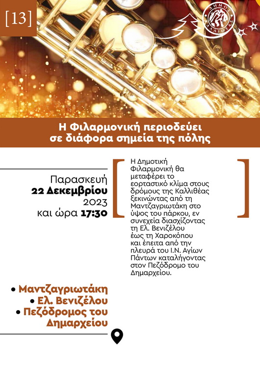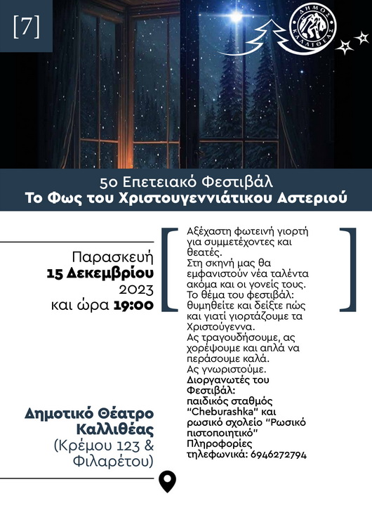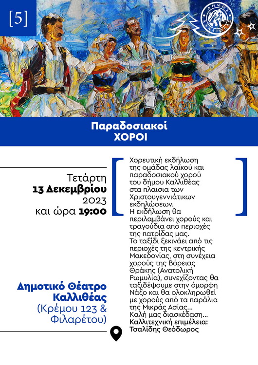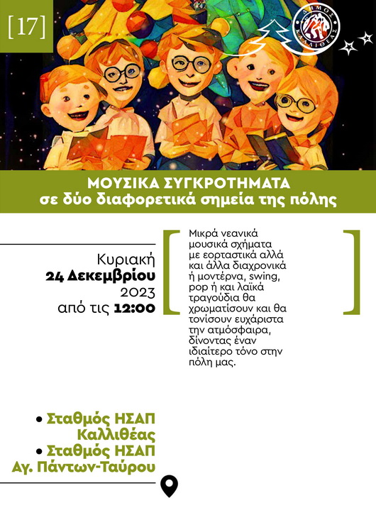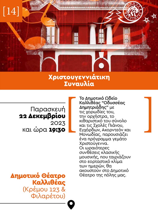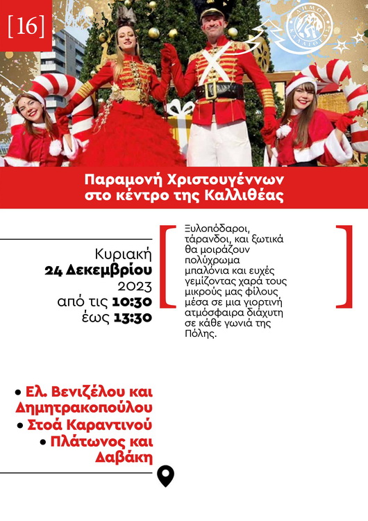 Ο Δήμος Καλλιθέας ξεκινά τις χριστουγεννιάτικες εκδηλώσεις οι οποίες θα διαρκέσουν μέχρι 3 Ιανουαρίου. Την Παρασκευή 8 Δεκεμβρίου 2023 ώρα 19:00 θα ανάψει το Χριστουγεννιάτικο Δέντρο στο Χωριό του Άι Βασίλη στην Πλατεία Δαβάκη από τον Γρηγόρη Μπιθικώτση και την Σταυρούλα Εσαμπαλίδη τις υπόλοιπες εκδηλώσεις μέχρι 31 Δεκεμβρίου μπορείτε να δείτε παρακάτω όπως αναρτήθηκαν στην σελίδα του Δήμου Καλλιθέας