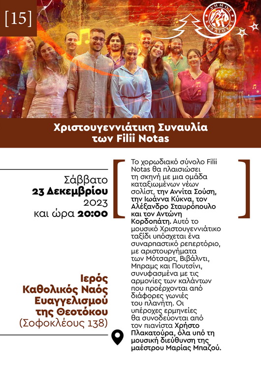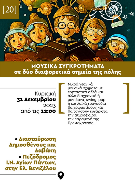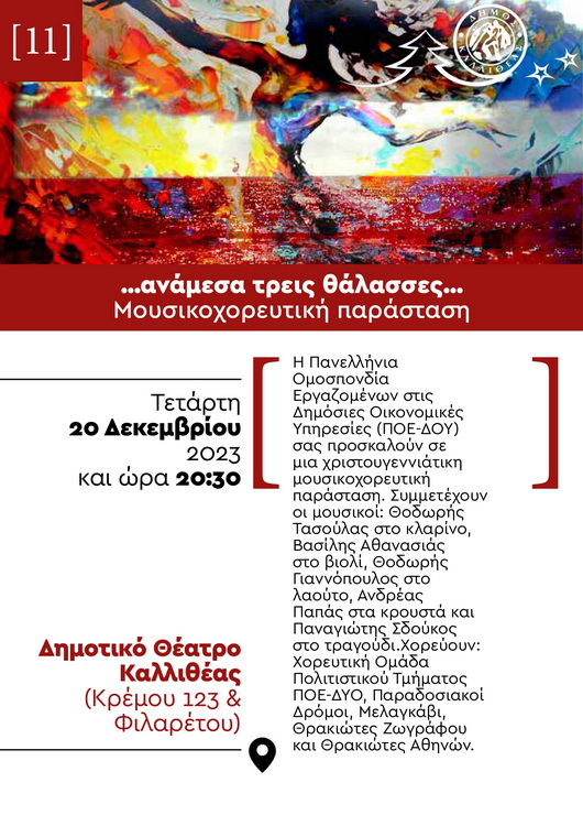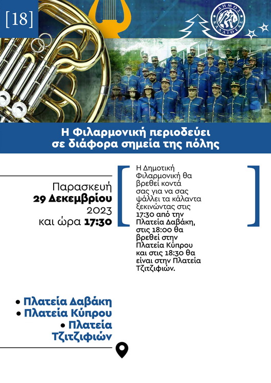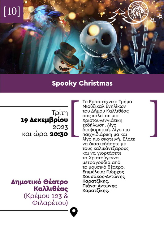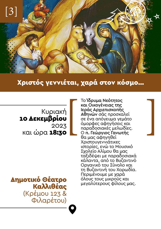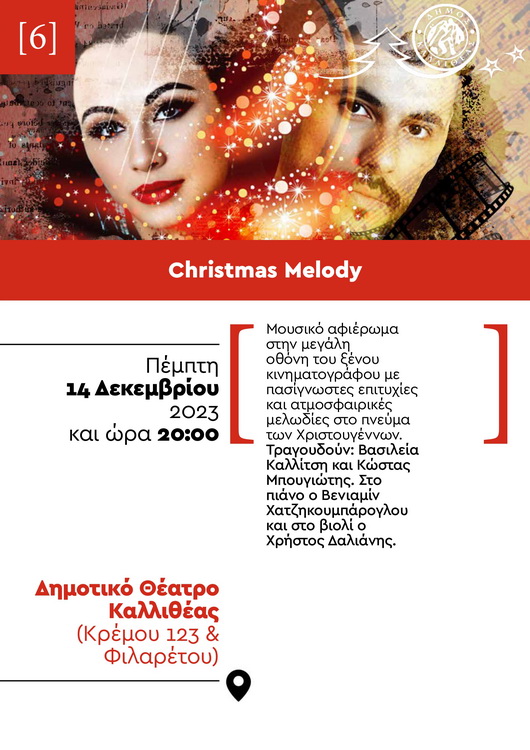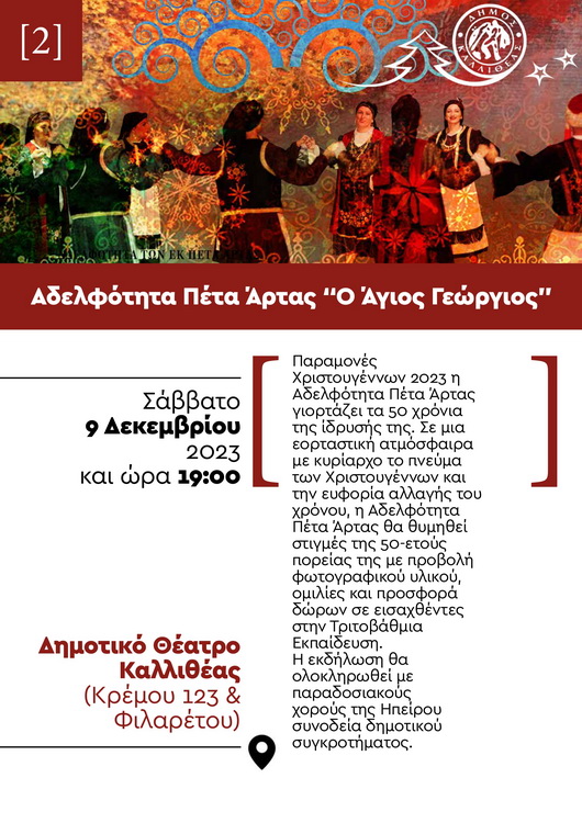 Ο Δήμος Καλλιθέας ξεκινά τις χριστουγεννιάτικες εκδηλώσεις οι οποίες θα διαρκέσουν μέχρι 3 Ιανουαρίου. Την Παρασκευή 8 Δεκεμβρίου 2023 ώρα 19:00 θα ανάψει το Χριστουγεννιάτικο Δέντρο στο Χωριό του Άι Βασίλη στην Πλατεία Δαβάκη από τον Γρηγόρη Μπιθικώτση και την Σταυρούλα Εσαμπαλίδη τις υπόλοιπες εκδηλώσεις μέχρι 31 Δεκεμβρίου μπορείτε να δείτε παρακάτω όπως αναρτήθηκαν στην σελίδα του Δήμου Καλλιθέας