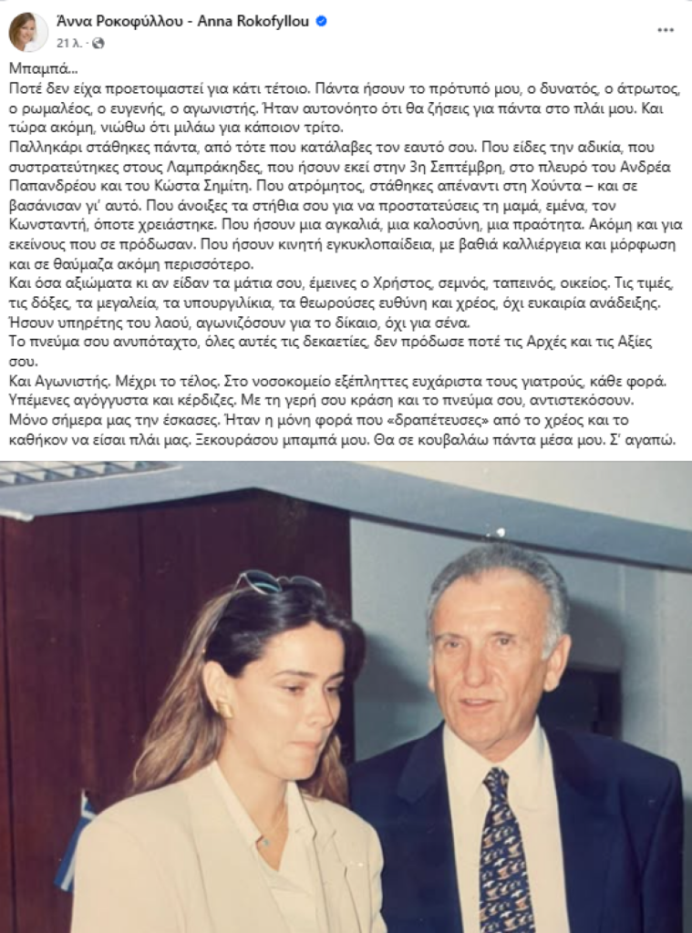 Με μια συγκινητική ανάρτηση στα μέσα κοινωνικής δικτύωσης, η Άννα Ροκοφύλλου αποχαιρέτισε τον πατέρα της, Χρήστο Ροκόφυλλο, που έφυγε από τη ζωή τα ξημερώματα του Σαββάτου (24/05)
