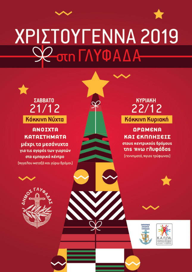 Η Γλυφάδα θα φορέσει τη στολή του Αη Βασίλη και θα υποδεχθεί τα Χριστούγεννα με κέφι, χορό και πολλή αγάπη. Το Σάββατο 21 και την Κυριακή 22 Δεκεμβρίου όλη η πόλη θα είναι μια Γιορτή! Η «Κόκκινη Νύχτα» στις 21, η «Κόκκινη Κυριακή» στις 22, θα γεμίσουν χαρά μικρούς και μεγάλους. Το Σάββατο 21 Δεκεμβρίου τα καταστήματα στη Γλυφάδα θα παραμείνουν ανοικτά έως τα μεσάνυχτα και η πόλη θα γεμίσει κόκκινα γιορτινά σκουφάκια.