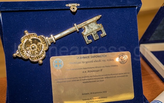 Σε κλειστή τελετή που πραγματοποιήθηκε στην αίθουσα εκδηλώσεων του Δήμου Ξηρομέρου λαμβάνοντας τα μέτρα προστασίας covid 19, ο Δήμος Ξηρομέρου τίμησε τρεις σπουδαίες προσωπικότητες καθεμία για τον ρόλο και τη προσφορά του στην Ελλάδα. Συγκεκριμένα, την Παρασκευή 20 Αυγούστου 2021, ο Δήμος Ξηρομέρου ανακήρυξε επίτιμο δημότη Δήμου Ξηρομέρου και απένειμε το χρυσό κλειδί της πόλης στον Μακαριότατο Αρχιεπίσκοπο Αθηνών και πάσης Ελλάδος κ.κ Ιερώνυμο ως ένδειξη αναγνώρισης της εκκλησίας στον απελευθερωτικό αγώνα από τον οθωμανικό ζυγό, αλλά και το πολυσήμαντο ποιμαντικό, ανθρωπιστικό, κοινωνικό και περιβαλλοντικό του έργο. Λόγω σοβαρού προσωπικού θέματος, τον Μακαριότατο εκπροσώπησε ο Θεοφιλέστατος Άγιος Θαυμακού κ.κ. Ιάκωβος.