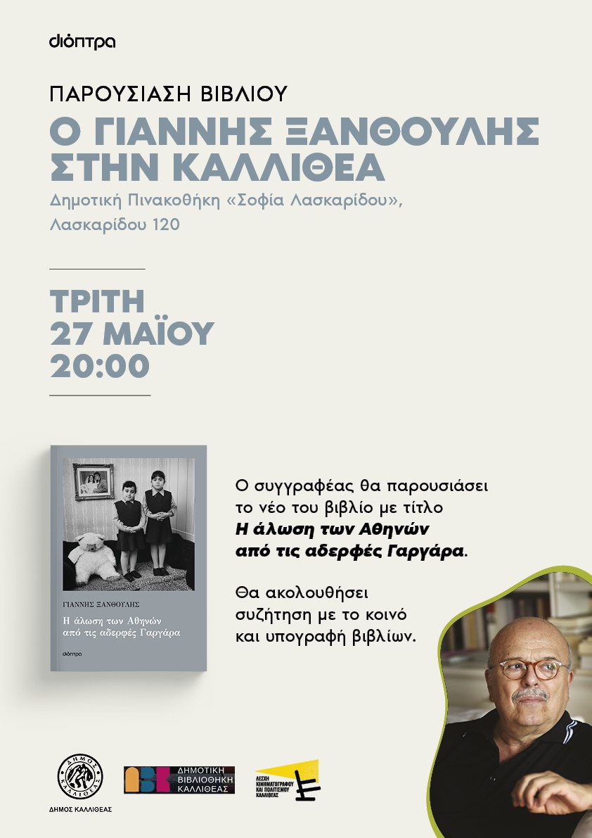 Η ΛΕΣΧΗ ΚΙΝΗΜΑΤΟΓΡΑΦΟΥ ΚΑΙ ΠΟΛΙΤΙΣΜΟΥ ΚΑΛΛΙΘΕΑΣ και η ΔΗΜΟΤΙΚΗ ΒΙΒΛΙΟΘΗΚΗ ΚΑΛΛΙΘΕΑΣ μας προσκλούν την Τρίτη 27/5 στις 8μμ στην Δημοτική Πινακοθήκη «Σοφία Λασκαρίδου» (Λασκαρίδου 120) στην παρουσίαση του νέου βιβλίου «Η Άλωση των Αθηνών από τις αδερφές Γαργάρα» του μυθιστοριογράφου, δημοσιογράφου και θεατρικού συγγραφέα, Γιάννη Ξανθούλη ένα μόλις μήνα μετά την κυκλοφορία του.