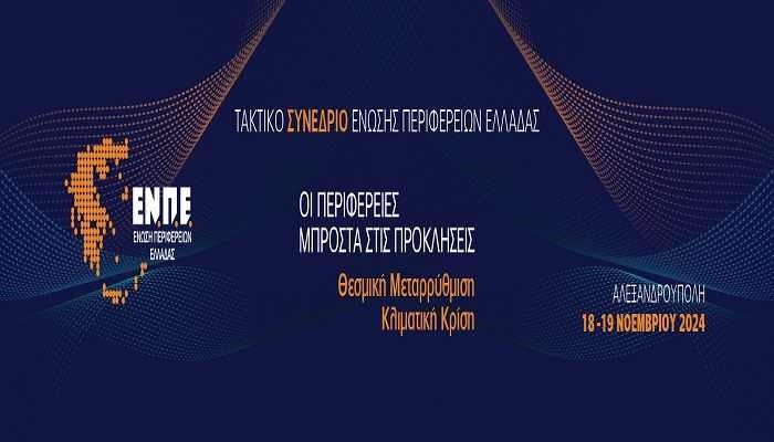 Στην Αλεξανδρούπολη θα πραγματοποιηθεί το Τακτικό Συνέδριο της Ένωσης Περιφερειών Ελλάδας, το διήμερο 18 και 19 Νοεμβρίου 2024, με θέμα: “Οι Περιφέρειες μπροστά στις προκλήσεις: Θεσμική Μεταρρύθμιση – Κλιματική Κρίση”.