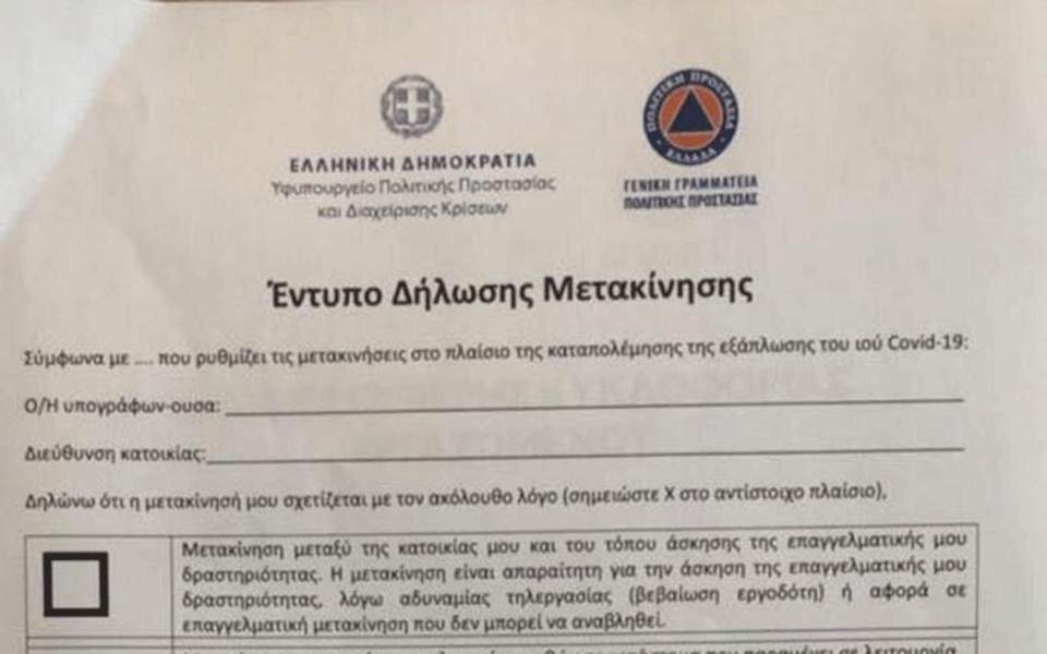 Τους λόγους για τους οποίους επέλεξαν να μετακινηθούν θα δηλώνουν σε έγγραφο οι πολίτες μετά την επιβολή περιορισμών στις μετακινήσεις που ανακοίνωσε ο πρωθυπουργός Κυριάκος Μητσοτάκης, στο πλαίσιο περιορισμού μετάδοσης του κορωνοϊού.