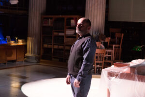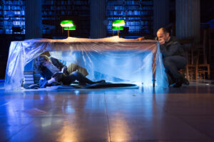 Ο χώρος του Αναγνωστηρίου στο Βαλλιάνειο Μέγαρο της Εθνικής Βιβλιοθήκης της Ελλάδος προσδίδει ειδικό βάρος (μετέχοντας και αυτός στην αφήγηση) στην εμπειρία των ερμηνευτών. Αφηγούνται την ιστορία, σαν μια ζωντανή μαρτυρία: κάποιοι που ήταν εκεί πριν από αυτούς, άφησαν τα ίχνη τους. Υπάρχουν βιβλία, υλικά βιντεοπροβολών, αντικείμενα, χειρόγραφες σελίδες του κειμένου, σημειώσεις δικές τους και των άλλων