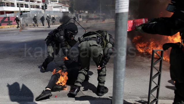Στις φλόγες τυλίχθηκε ένας διαδηλωτής στη Θεσσαλονίκη από βόμβα μολότοφ, με τους αστυνομικούς να σβήνουν τη φωτιά. Τα επεισόδια σημειώθηκαν το μεσημέρι της Πέμπτης (15/4) μετά το πανεκπαιδευτικό συλλαλητήριο.