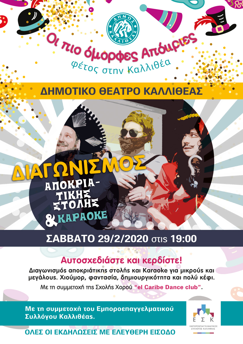 Ο Δήμος Καλλιθέας διοργανώνει μια ζεστή βραδιά με διαγωνισμό αποκριάτικης στολής, για μικρούς και μεγάλους, και Karaoke, το Σάββατο 1 Μαρτίου στις 7 το απόγευμα, στο Δημοτικό Θέατρο (Κρέμου και Φιλαρέτου).