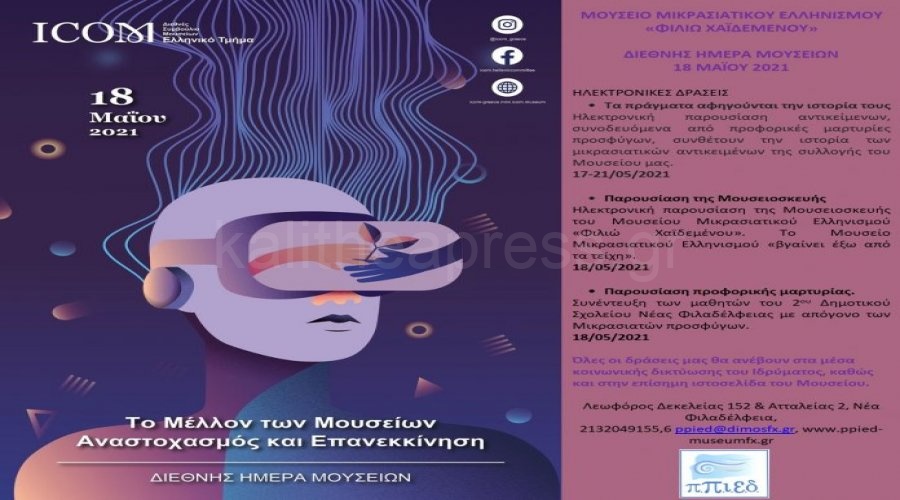 Το Μουσείο Μικρασιατικού Ελληνισμού «Φιλιώ Χαϊδεμένου» συμμετέχει στον διεθνή εορτασμό των Μουσείων 2021 με τις παρακάτω δράσεις: