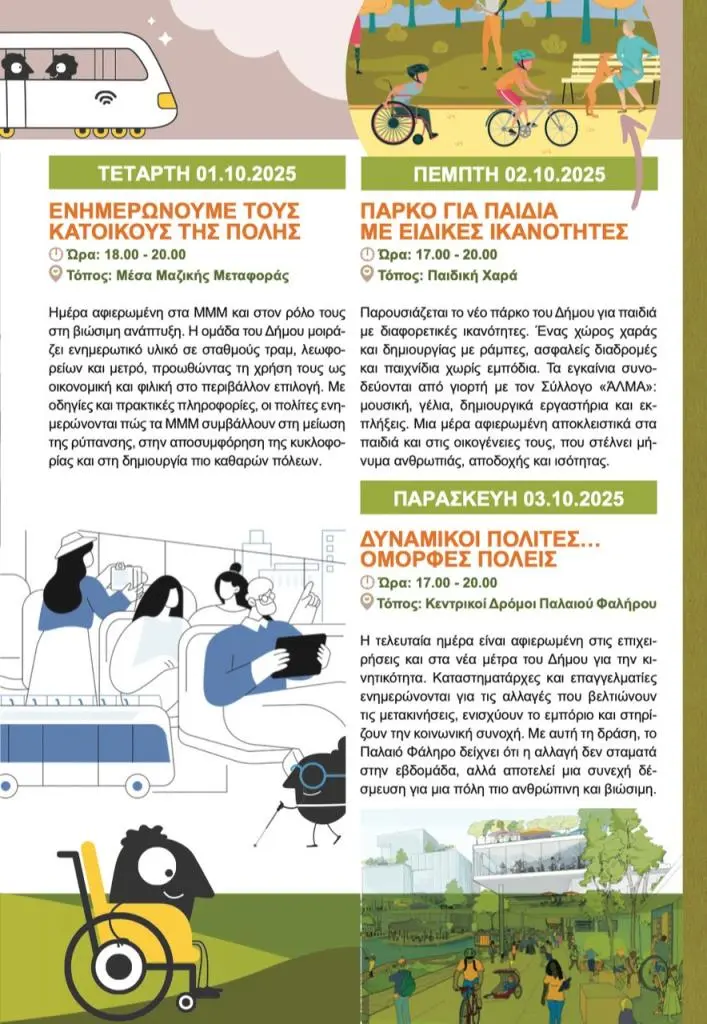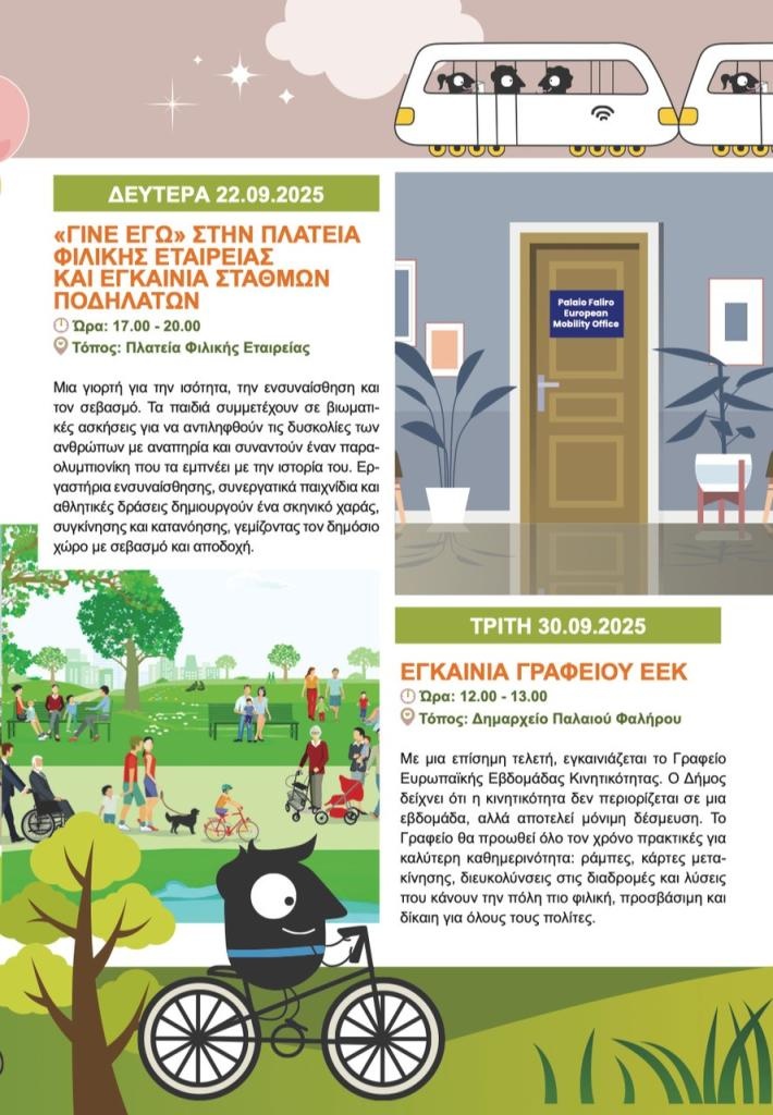 Η φετινή Ευρωπαϊκή Εβδομάδα Κινητικότητας στο Παλαιό Φάληρο αναδεικνύει την αξία της βιώσιμης μετακίνησης και του ενεργού πολίτη, δίνοντας σε όλους μας την ευκαιρία να φανταστούμε και να χτίσουμε ένα μέλλον όπου οι πόλεις είναι πιο ανθρώπινες, οι κοινότητες πιο δεμένες και οι δημόσιοι χώροι προσβάσιμοι για όλους.