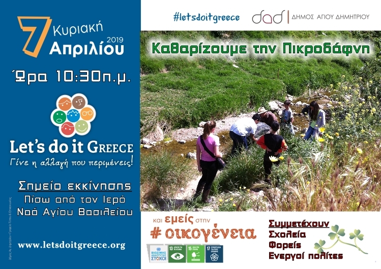 Στόχος του Δήμου Αγίου Δημητρίου και αυτή τη χρονιά, μέσα από τη συμμετοχή στο «Let’s do it Greece 2019», είναι ο καθαρισμός του ρέματος και η αλλαγή της όψης του στα σημεία παρέμβασης.