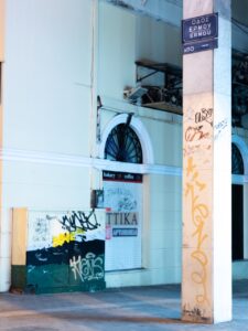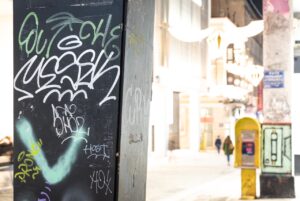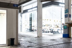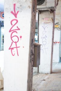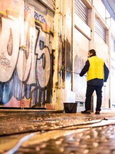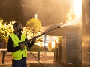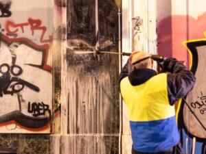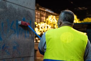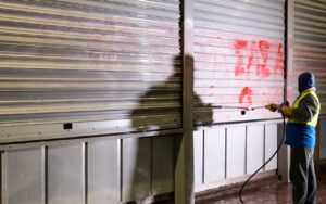 O καθαρισμός σε ρολά καταστημάτων έγινε σε συνεννόηση με τους ιδιοκτήτες, ενώ οι εργασίες πραγματοποιήθηκαν την νύχτα ώστε να μην εμποδίζεται η λειτουργία τους.