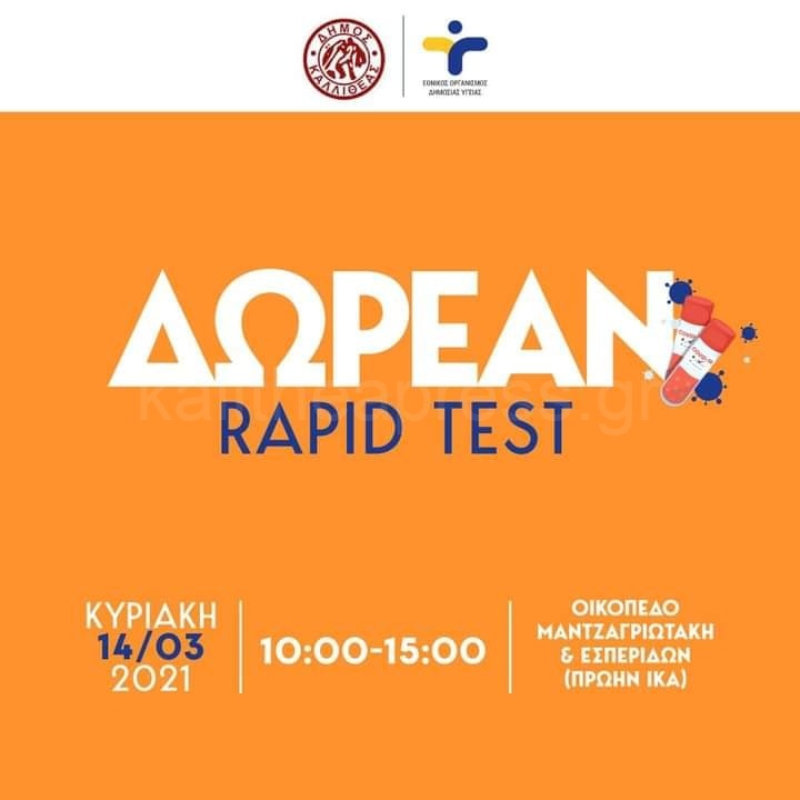Ο Δήμος Καλλιθέας σε συνεργασία με τον ΕΟΔΥ την Κυριακή 14 Μαρτίου 2021 πραγματοποιεί Δωρεάν rapid test Από τις 10:00 έως 15:00 στο Οικόπεδο Μαντζαγριωτακη & Εσπερίδων