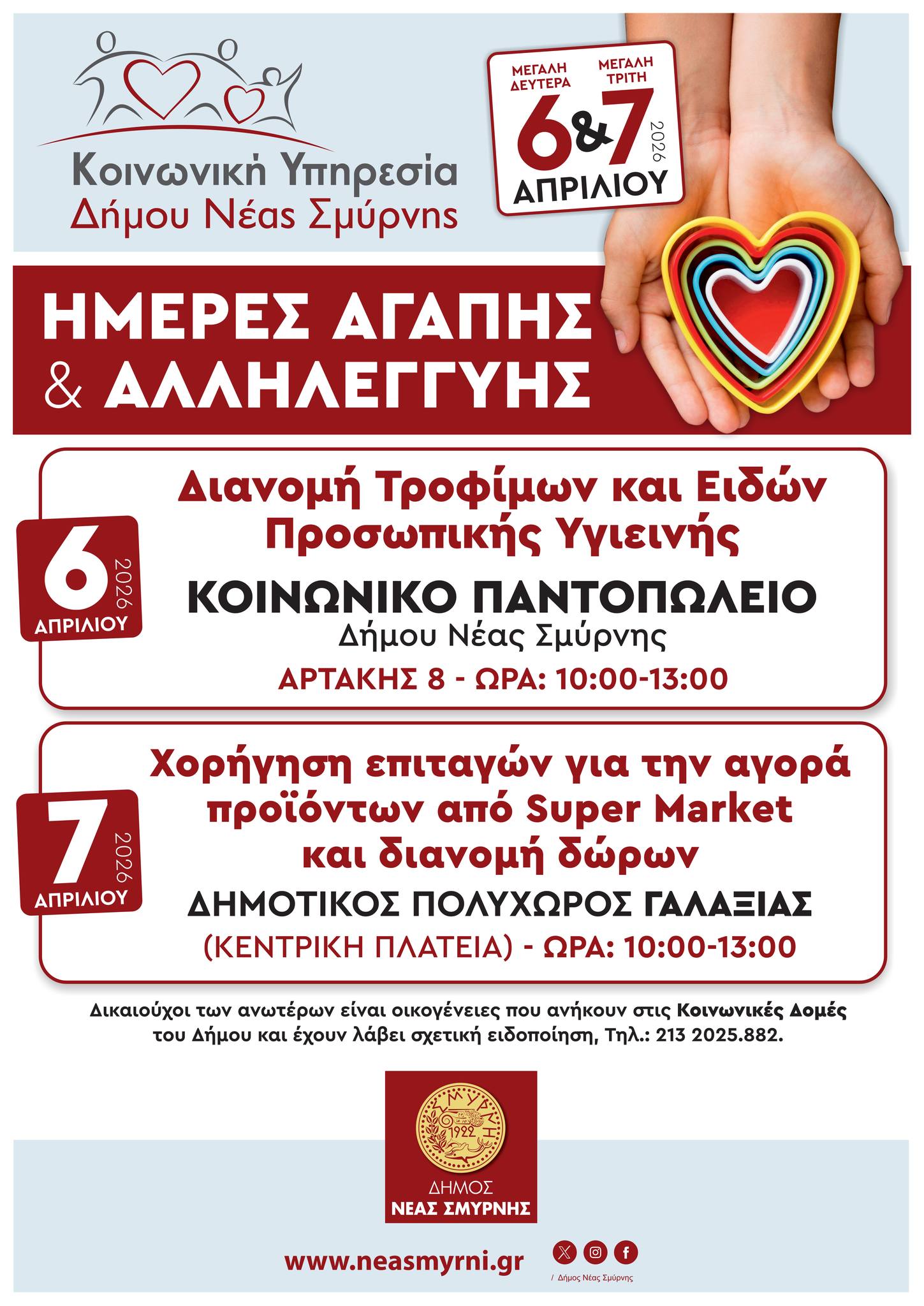 Ο Δήμος Νέας Σμύρνης ενίσχυσε για άλλη μια φορά τους οικονομικά ευάλωτους πολίτες του, δείχνοντας ότι η αλληλεγγύη και η κοινωνική στήριξη είναι προτεραιότητες για την τοπική κοινωνία, ιδιαίτερα ενόψει των εορτών του Πάσχα.