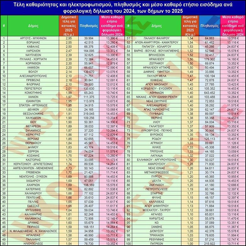 Με διαδικτυακή έρευνα καταγράφηκαν τα δημοτικά τέλη κατοικιών σε 100 δήμους της χώρας και παρουσιάζονται συγκεντρωμένα στον παρακάτω πίνακα. Για τους δήμους που διαθέτουν περισσότερες από μία ζώνες δημοτικών τελών, υπολογίστηκε ο μέσος όρος των τιμών. Στον πίνακα περιλαμβάνονται επίσης ο πληθυσμός κάθε δήμου, σύμφωνα με την απογραφή της ΕΛΣΤΑΤ το 2021, καθώς και το μέσο καθαρό εισόδημα ανά φορολογική δήλωση για το 2024, όπως προκύπτει από τα στοιχεία της ΑΑΔΕ. Επειδή δεν υπάρχουν διαθέσιμα εισοδηματικά δεδομένα ανά δήμο, χρησιμοποιήθηκε το αντίστοιχο εισόδημα της Περιφερειακής Ενότητας στην οποία ανήκει ο κάθε δήμος.