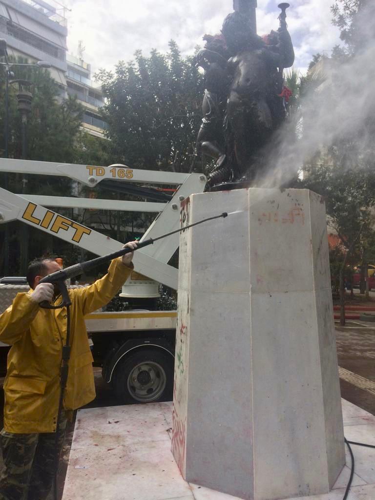 Παράλληλα ειδικά συνεργεία επισκεύασαν, όπου χρειαζόταν, και έβαψαν παγκάκια και καλαθάκια απορριμμάτων ενώ βάφτηκαν και τα παρτέρια. Στα Εξάρχεια καθαρίστηκαν μπογιές και γκράφιτι από το άγαλμα όπως και από όλα τα σημεία της πλατείας ενώ η Διεύθυνση Πρασίνου κλάδεψε και περιποιήθηκε τα δέντρα και τα φυτά φυτεύοντας και νέα. Επίσης αντικαταστάθηκαν οι λάμπες όπου χρειαζόταν και ενισχύθηκε ο φωτισμός.