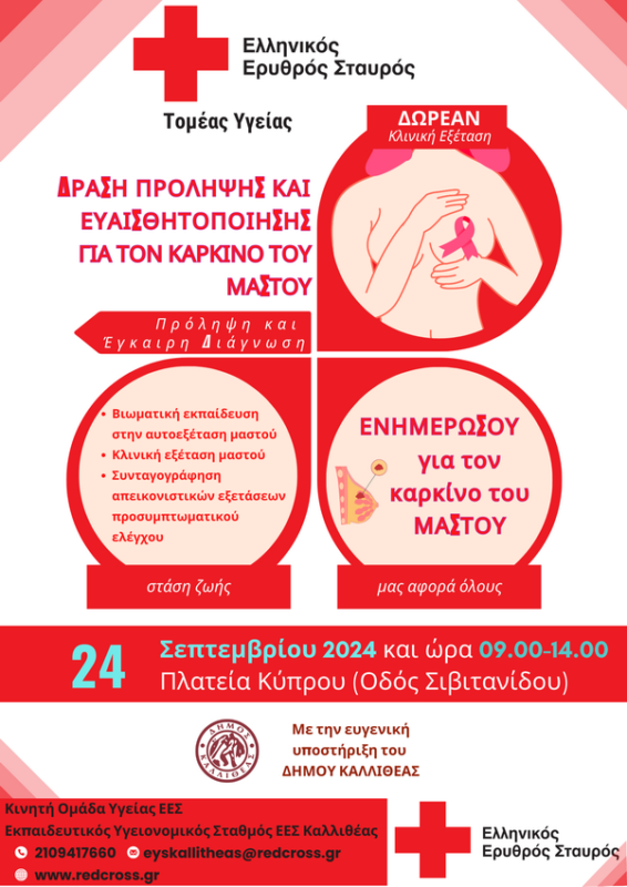 Ο Ελληνικός Ερυθρός Σταυρός, προκειμένου να αυξήσει την ευαισθητοποίηση των γυναικών σχετικά με τον καρκίνο του μαστού, διοργανώνει για 15η συνεχή χρονιά στην Καλλιθέα, δράση Ενημέρωσης για την πρόληψη και την πρώιμη ανίχνευση του γυναικείου καρκίνου, με την ευγενική υποστήριξη του Δήμου Καλλιθέας. Η πρωτοβουλία αυτή στοχεύει , στην ενημέρωση του κοινού για τους παράγοντες κινδύνου που σχετίζονται με τον καρκίνο του μαστού, στην ενθάρρυνση του προσυμπτωματικού ελέγχου, στην ευαισθητοποίηση για την ανάγκη εκπαίδευσης στην αυτοεξέταση του μαστού.