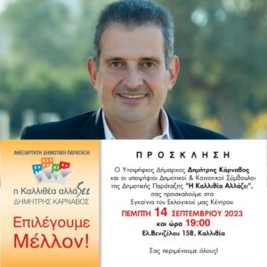 Ο Δήμαρχος Καλλιθέας και εκ νέου υποψήφιος Δημήτρης Κάρναβος και οι υποψήφιοι της Δημοτικής Παράταξης “Η Καλλιθέα Αλλάζει” την Πέμπτη 14 Σεπτεμβρίου 2023 στις 19.00 μας προσκαλούν στα εγκαίνια του εκλογικού κέντρου που βρίσκεται στην Λεοφώρο Ελευθερίου Βενιζέλου 158