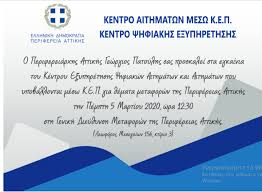 Τα Εγκαίνια του Κέντρου Εξυπηρέτησης Ψηφιακών Αιτημάτων της Περιφέρειας Αττικής θα πραγματοποιηθούν αύριο Πέμπτη 5 Μαρτίου στις 12.30 από τον Περιφερειάρχη Αττικής στη Γενική Διεύθυνση Μεταφορών της Περιφέρειας Αττικής στη Λεοφόρο Μεσογείων 156 στο κτίριο 3