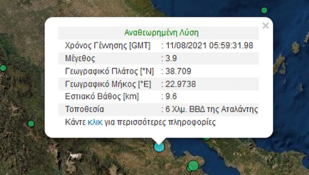 Η δόνηση, σύμφωνα με το Γεωδυναμικό Ινστιτούτο, έγινε 6 χλμ βόρεια-βορειοδυτικά της Αταλάντης και ήταν επιφανειακός, με βάθος μόλις 6,9 χλμ.
