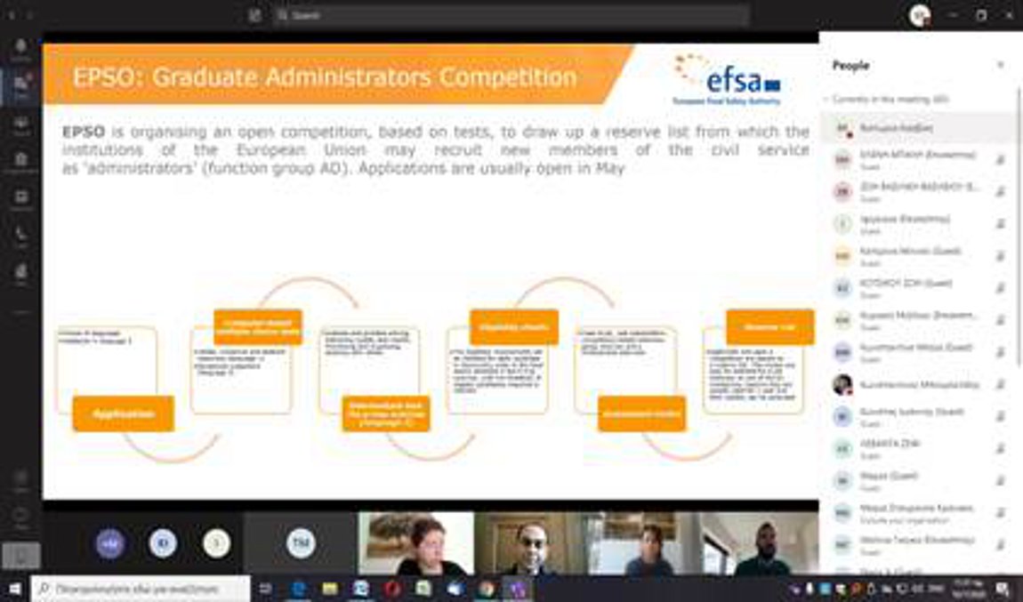 Ομιλητές ήταν ο κύριος Παναγιώτης Καλαβρός, Talent Selection Officer, Human Capital Unit in European Food Safety Authority, και η κυρία Marta Almeida Martins, Trainee at Talent Selection Team, Human Capital Unit in European Food Safety Authority. O σκοπός του συγκεκριμένου ενημερωτικού σεμιναρίου ήταν να παρουσιάσει, αφενός, σε φοιτητές και αποφοίτους τις δυνατότητες απασχόλησης που προσφέρονται σε οργανισμούς και φορείς της Ευρωπαϊκής Ένωσης και, αφετέρου, να αναλυθεί ως παράδειγμα, η διαδικασία επιλογής προσωπικού στην «Ευρωπαϊκή Αρχή για την Ασφάλεια των Τροφίμων» (European Food Safety Authority).