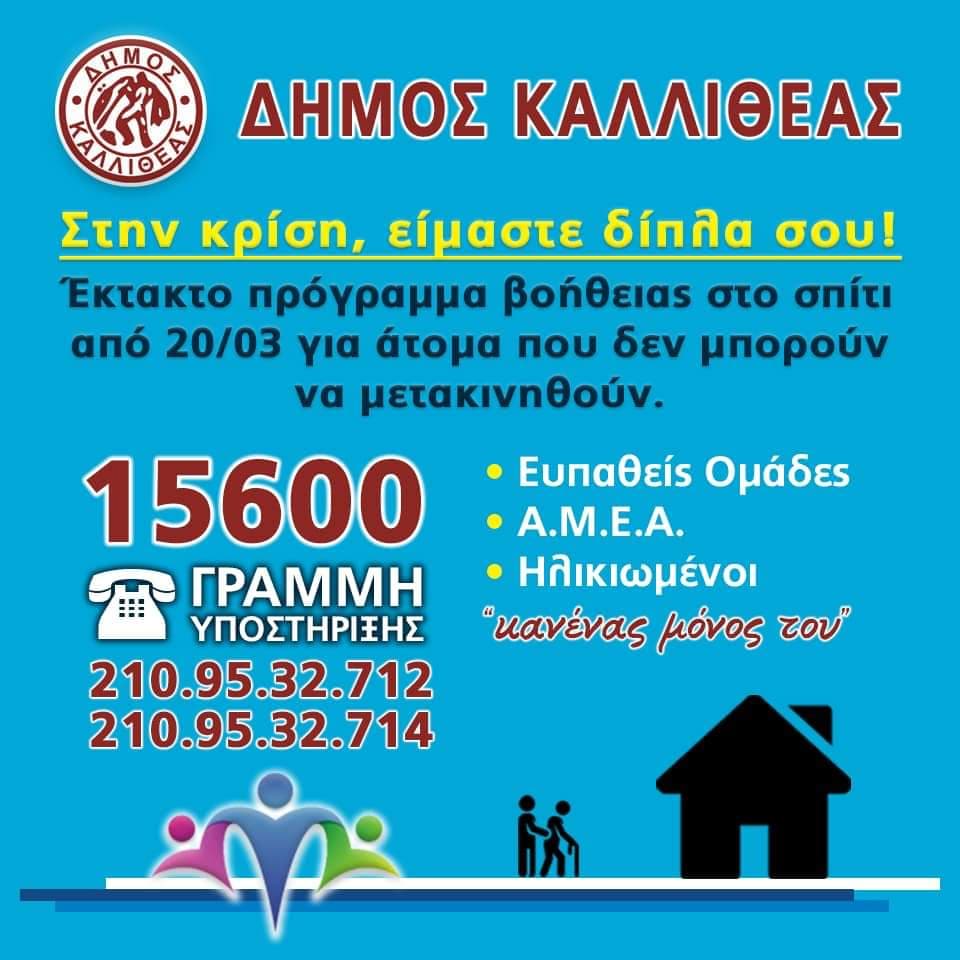 Αύριο ξεκινά ο Δήμος Καλλιθέας έκτακτο πρόγραμμα βοήθειας για τις ευπαθείς ομάδες τους ΑΜΕΑ τους ηλικιωμένους το πρόγραμμα αναφέρεται ΒΟΉΘΕΙΑ ΣΤΟ ΣΠΊΤΙ και αφορά τα μέτρα που παίρνει ο Δήμος Καλλιθέας για τους Δημότες.
