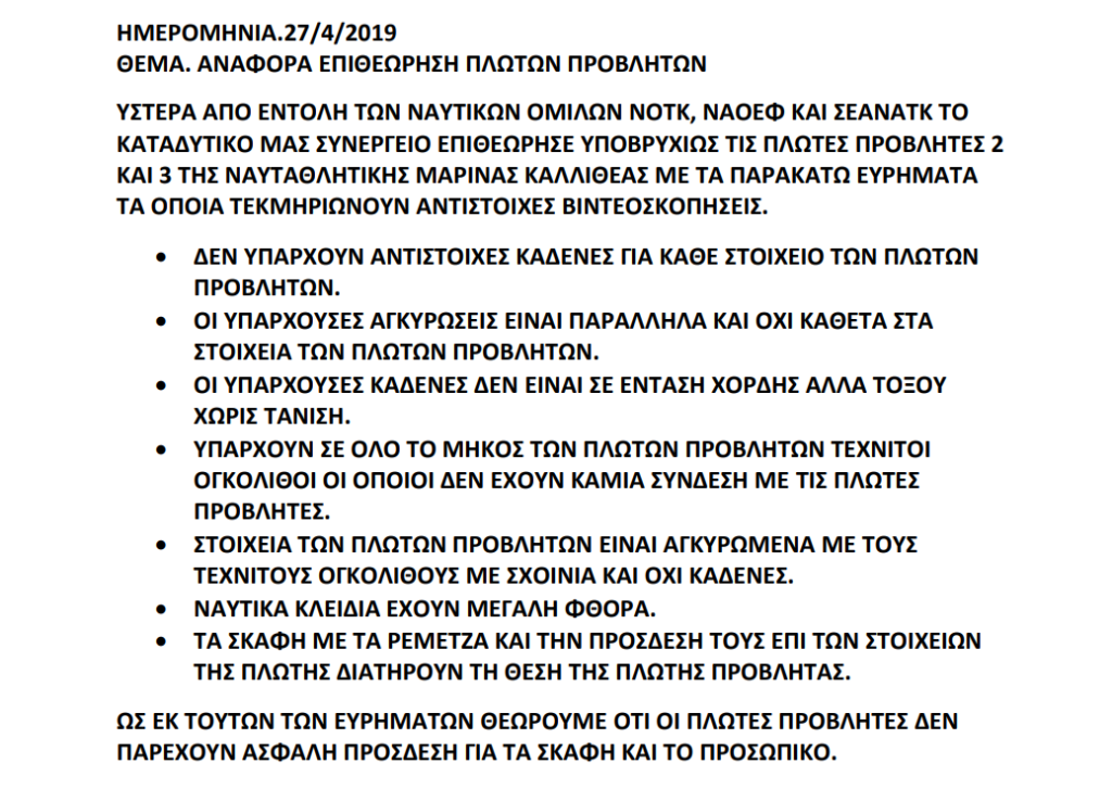 Νο 1. Αρίθμηση πλωτών προβλητών (δορυφορική εικόνα από Google Earth) No 2-10. Φωτογραφίες προβλήτας Νο 3 Νο 3. Νο 4,5. Καλώδια παροχής ρεύματος (κομμένοι φορείς) Νο 5. Καδένες σύνδεσης της προβλήτας με τον μόλο Νο 6. Νο 7. Σημείο αγκύρωσης της κεφαλής στον βυθό Νο 8-10. Πυροσβεστικές φωλιές Νο 9. Νο 10. Νο 11-17. Φωτογραφίες προβλήτας Νο 2 Νο 12. Νο 13. Αρμός ανάμεσα στην κεφαλή και το τελευταίο οριζόντιο στοιχείο Νο 14. No 15. Ρηγματώσεις / αποκολλήσεις σκυροδέματος και αποκάλυψη οπλισμών Νο 16,17. Πυροσβεστική φωλιά Νο 17. Νο 18-20. Πυροσβεστικές φωλιές στον μόλο Νο 19. Νο 20. Πλοήγηση άρθρων Οι απαντήσεις στο Kallithea Press των υποψηφίων Δημοτικών Συμβούλων της Καλλιθέας Kεντρικη ομιλία υποψήφιου Δημάρχου Δημήτρη Πιτούλη