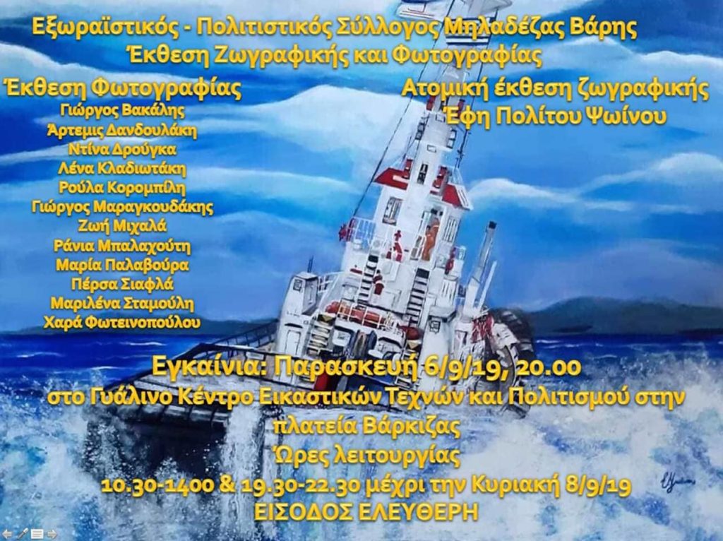 Ο Εξωραϊστικός – Πολιτιστικός Σύλλογος Μηλαδέζας Βάρης, διοργανώνει στις 6 Σεπτεμβρίου Έκθεση Ζωγραφικής και Φωτογραφίας στο Γυάλινο Κέντρο Εικαστικών Τεχνών και Πολιτισμού στην παραλία της Βάρκιζας. Στην έκθεση θα υπάρχει Ατομική Έκθεση Ζωγραφικής της ζωγράφου Έφης Πολίτου Ψωΐνου, με υπέροχα έργα όπως η ίδια ξέρει να δημιουργεί.