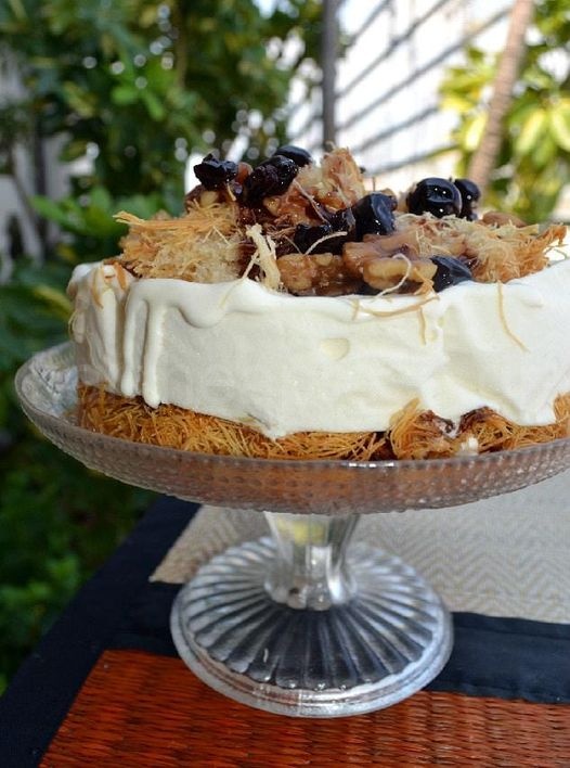 Βγάζουμε από το φούρνο το καταϊφι, έτσι όπως είναι καυτό, το περιχύνουμε με το κρύο σιρόπι κουταλίτσα κουταλίτσα και το αφήνουμε να κρυώσει. Έπειτα μεταφέρουμε προσεκτικά το σιροπιασμένο κρύο καταΐφι σε μια πιατέλα. Στρώνουμε τη μισή κρέμα από πάνω δημιουργώντας ροζέτες. Σκεπάζουμε με το δεύτερο δίσκο από καταΐφι. Διακοσμούμε με την υπόλοιπη κρέμα. Πασπαλίζουμε με τριμμένο φιστίκι ή καρύδια καραμελωμένα και γλυκό του κουταλιού βύσσινο.