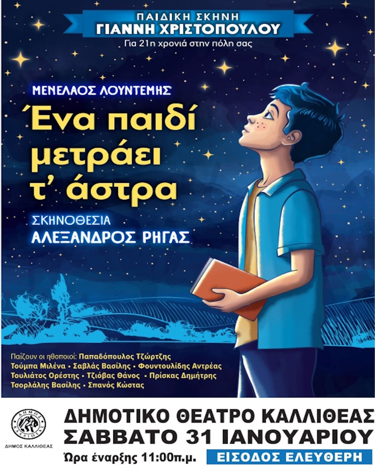 Η παιδική σκηνή «Γιάννη Χριστόπουλου» σας προσκαλεί στη θεατρική παράσταση «Ένα παιδί μετράει τ’ άστρα», ένα έργο-ύμνο για το σχολείο, το βιβλίο και το δάσκαλο, που θα παρουσιαστεί στο Δημοτικό Θέατρο Καλλιθέας (Κρέμου 123 & Φιλαρέτου) το Σάββατο 31 Ιανουαρίου 2026, ώρα 11:00 π.μ.