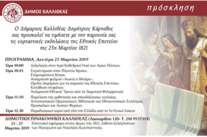 Ο Δήμαρχος Καλλιθέας Δημήτριος Κάρναβος σας προσκαλεί να τιμήσετε με την παρουσία σας τις εορταστικές εκδηλώσεις της εθνικής επετείου της 25ης Μαρτίου 1821.