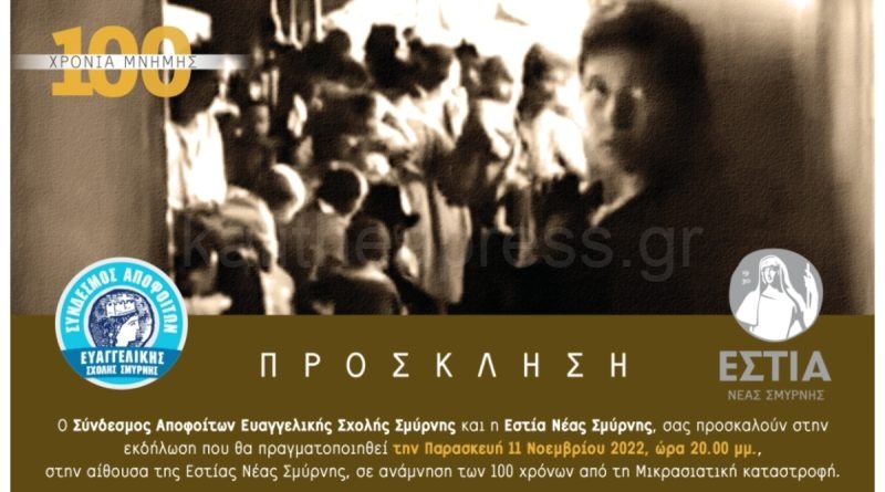 Ο Σύνδεσμος Αποφοίτων Ευαγγελικής Σχολής Σμύρνης και η ΕΣΤΙΑ Νέας Σμύρνης, συμμετέχοντας στις εκδηλώσεις μνήμης για την επέτειο των 100 χρόνων από τη Μικρασιατική Καταστροφή, διοργανώνουν κεντρική εκδήλωση, η οποία θα γίνει την Παρασκευή 11 Νοεμβρίου 2022 στις 8.00 μμ στην ΕΣΤΙΑ Νέας Σμύρνης.