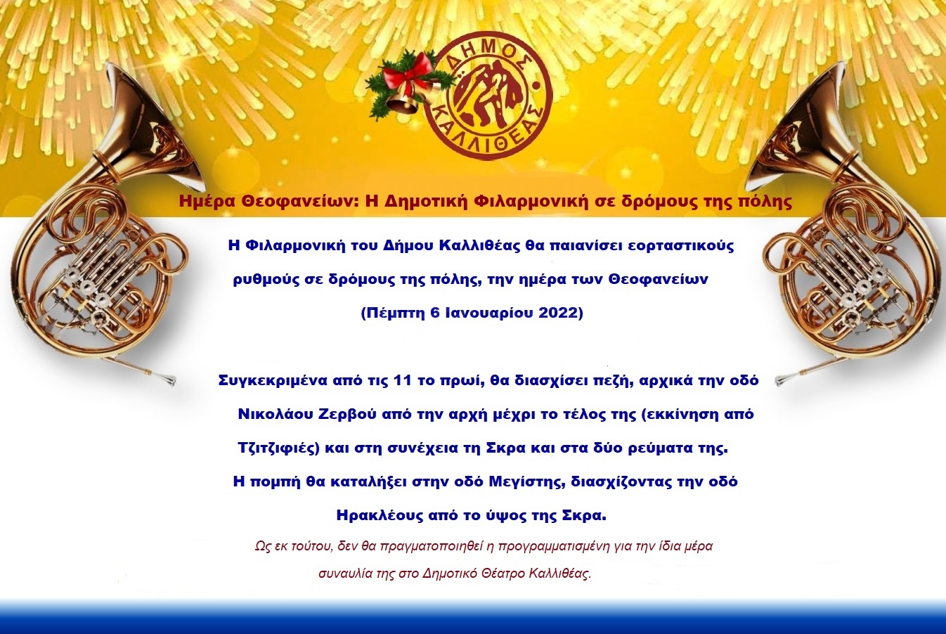 Η Φιλαρμονική του Δήμου Καλλιθέας θα παιανίσει εορταστικούς ρυθμούς σε δρόμους της πόλης, την ημέρα των Θεοφανίων (Πέμπτη 6 Ιανουαρίου 2022).