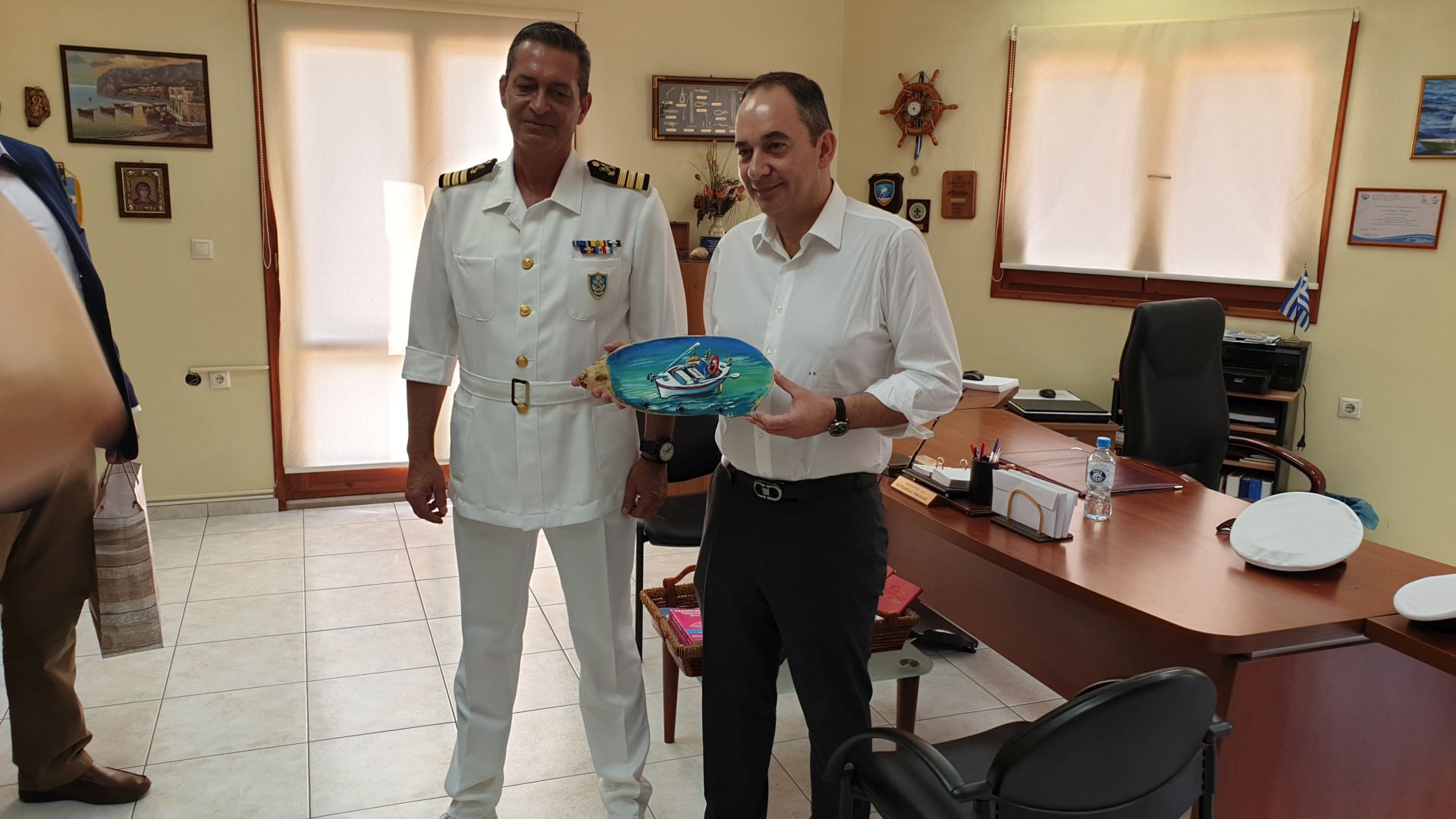 Στο Λιμεναρχείο Σκιάθου τον κ. Υπουργό υποδέχθηκαν ο Διοικητής της 4ης Περιφερειακής Διοίκηση Λ.Σ.-ΕΛ.ΑΚΤ. Αρχιπλοίαρχος Εμμανουήλ Κανάλης και ο Λιμενάρχης Σκιάθου Πλωτάρχης Νικόλαος Κατσάμπας, αλλά και το σύνολο του προσωπικού του Λιμεναρχείου.