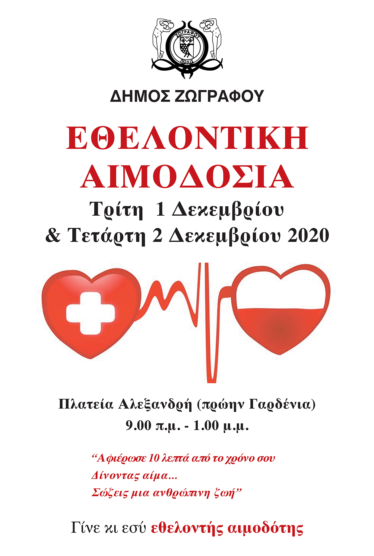 Για το λόγω αυτό, ο Δήμος Ζωγράφου, σε συνεργασία με την κινητή Μονάδα αιμοληψίας του Λαϊκού Νοσοκομείου, διοργανώνει εκ νέου διήμερο Εθελοντικής Αιμοδοσίας, την Τρίτη 1η και την Τετάρτη 2 Δεκεμβρίου 2020, από τις 9:00 π.μ. έως τη 1:00 μ.μ.., στην Πλατεία Γαρδένιας.