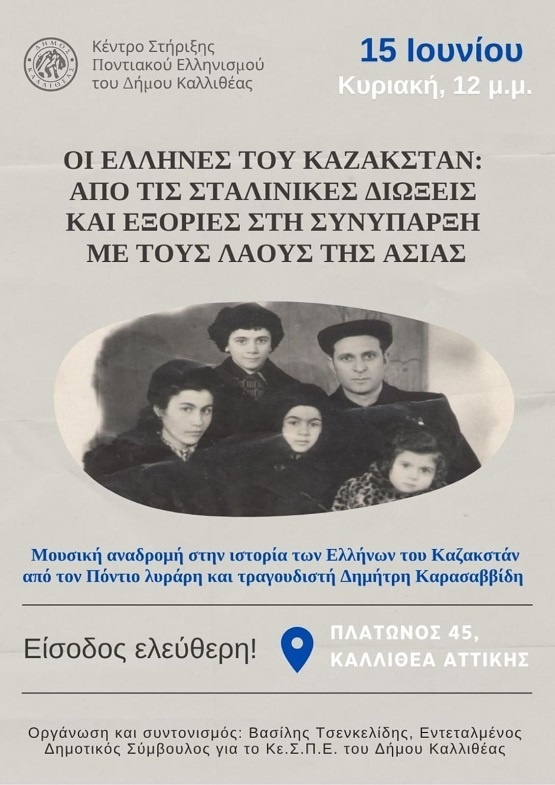 Το Κέντρο Στήριξης Ποντιακού Ελληνισμού (Κε.Σ.Π.Ε.) του Δήμου Καλλιθέας Αττικής διοργανώνει εκδήλωση ιστορικής μνήμης την Κυριακή 15 Ιουνίου 2025. Η εκδήλωση, με τίτλο “Οι Έλληνες του Καζακστάν: από τις σταλινικές διώξεις και εξορίες στη συνύπαρξη με τους λαούς της Ασίας”, θα εστιάσει στις διώξεις και τις εξορίες των Ελλήνων της ΕΣΣΔ που έλαβαν χώρα στη Σιβηρία και την Κεντρική Ασία κατά τα έτη 1937, 1942, 1944 και 1949.