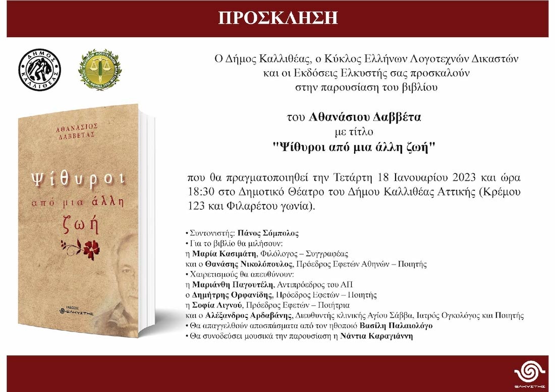 Παρουσίαση του βιβλίου του Αθανάσιου Δαββέτα «Ψίθυροι από μια άλλη ζωή»