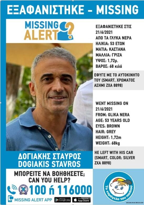 Εξαφάνιση μυστήριο έχει αναστατώσει από χτες την περιοχή Γλυκά Νερά και αφορά αυτή του 53χρονου επιχειρηματία Σταύρου Δογιάκη, για τον οποίο έχει εκδοθεί και missing alert νωρίτερα σήμερα. Σύμφωνα με την ανακοίνωση του “ΧΑΜΟΓΕΛΟΥ ΤΟΥ ΠΑΙΔΙΟΥ”