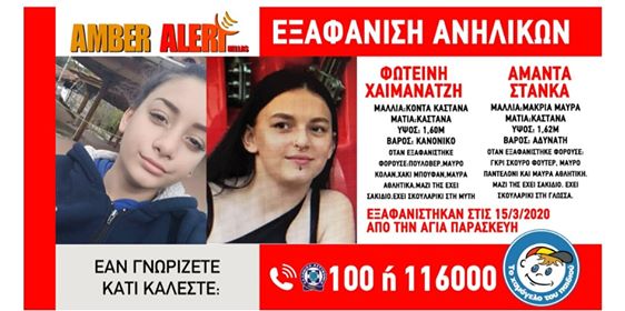 Στις 15.03.2020, και ώρα 14:00, εξαφανίστηκαν από την περιοχή της Αγίας Παρασκευής, οι ανήλικες Χαϊμανατζή Φωτεινή και Στάνκα Αμάντα, 14 και 16 ετών αντίστοιχα. «Το Χαμόγελο του Παιδιού» ενημερώθηκε για την εξαφάνιση των ανηλίκων στις 16.03.2020, απογευματινές ώρες και προχώρησε στην ενεργοποίηση του μηχανισμού AMBER ALERT HELLAS. Η Χαϊμανατζή Φωτεινή έχει κοντά καστανά μαλλιά, καστανά μάτια, ύψος 1.60μ, κανονικό βάρος και έχει σκουλαρίκι στην μύτη. Την ημέρα που εξαφανίστηκε φορούσε πουλόβερ, μαύρο κολάν, χακί μπουφάν και μαύρα αθλητικά παπούτσια. Κρατούσε σακίδιο πλάτης. Η Στάνκα Αμάντα έχει μακριά μαύρα μαλλιά, καστανά μάτια, ύψος 1.62μ, αδύνατη και έχει σκουλαρίκι στην γλώσσα. Κρατούσε σακίδιο πλάτης. Την ημέρα που εξαφανίστηκε φορούσε γκρι σκούρο φούτερ, μαύρο παντελόνι και μαύρα αθλητικά παπούτσια.