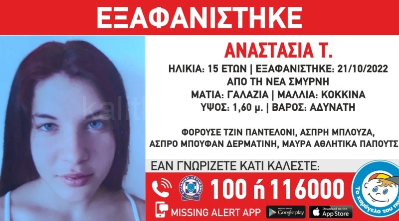 Στις 21/10/2022 στις 10:30, εξαφανίστηκε από δομή παιδικής προστασίας στη Νέα Σμύρνη η Αναστασία Τ., 15 ετών. «Το Χαμόγελο του Παιδιού» ενημερώθηκε σήμερα 21/10/2022 και προχώρησε στη δημοσιοποίηση των στοιχείων της ανήλικης κατόπιν εισαγγελικής εντολής καθώς συντρέχουν λόγοι που θέτουν τη ζωή της σε κίνδυνο καθώς πιθανόν να είναι εγκλωβισμένη σε μια επικίνδυνη κατάσταση από την οποία δεν μπορεί να διαφύγει. Η Αναστασία Τ. έχει ύψος 1,60 μ., είναι αδύνατη, έχει κόκκινα μαλλιά και γαλάζια μάτια. Φορούσε άσπρη μπλούζα, τζιν παντελόνι, άσπρο μπουφάν δερματίνη, μαύρα αθλητικά παπούτσια.