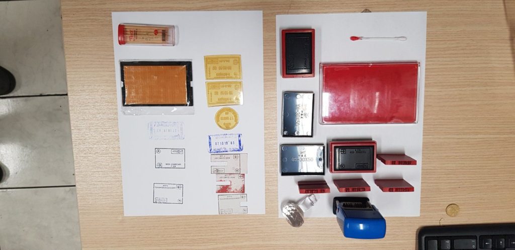 Συγκεκριμένα, ευρέθησαν δεκαεπτά (17) παραποιημένα-πλαστά διαβατήρια, τρεις (03) ταυτότητες, πλήθος σφραγίδων-αριθμοσφραγίδων, ανάγλυφες απολήξεις σφραγίδων, ομοιώματα σφραγίδων εισόδου καθώς και άλλα σύνεργα παραποίησης διαβατηρίων, χαρτονομίσματα διαφόρων χωρών (Ευρώπης, Ντονκ Βιετνάμ, Riyal Κατάρ, Ρινγκίτ Μαλαισίας, Ρούπια Σρι Λάνκα, Μπατ Ταϊλάνδης).