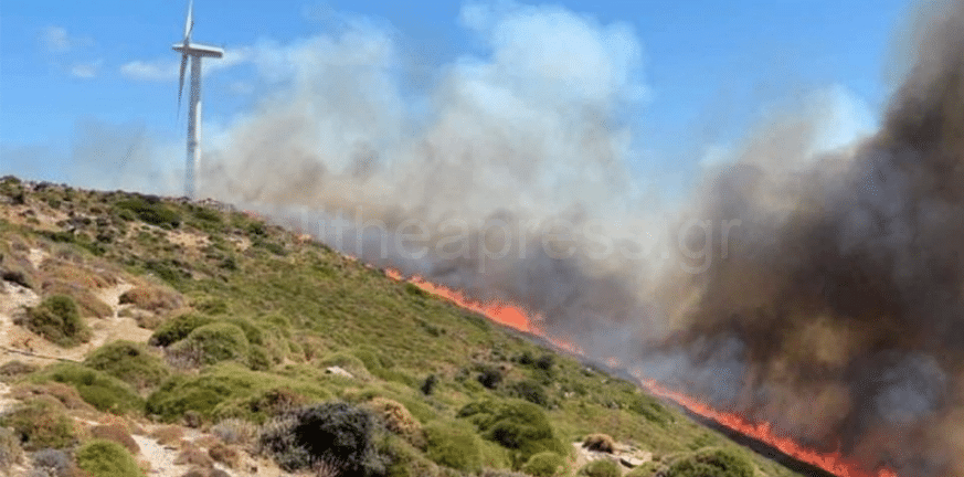 Στην ίδια περιοχή υπήρχε πυρκαγιά και πριν από δύο μέρες και μέχρι στιγμής δεν διευκρινίζεται εάν πρόκειται για νέα πυρκαγιά ή για κάποια επικίνδυνη αναζωπύρωση. Οι φλόγες καίνε δίπλα σε ανεμογεννήτριες.