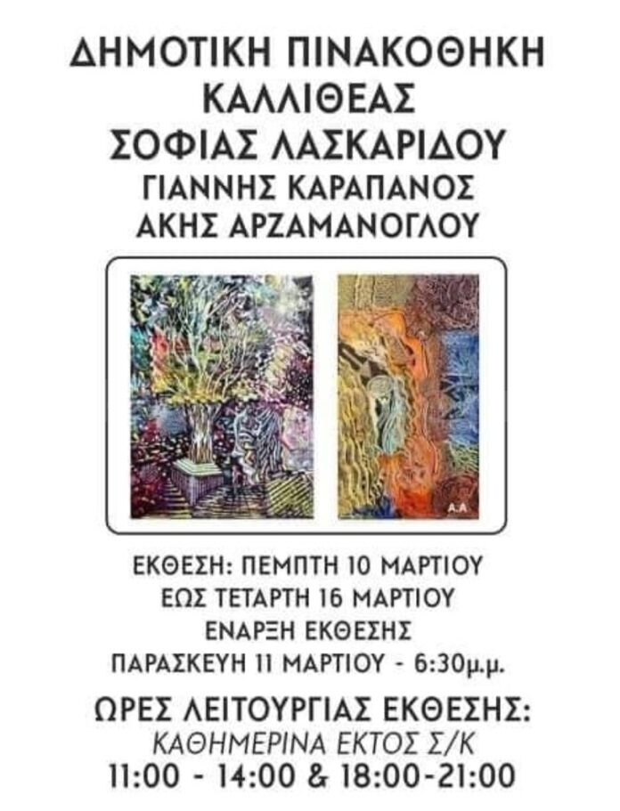 Οι δύο πολύ ιδιαίτεροι καλλιτέχνες Γιάννης Καραπάνος & Ιωακείμ Αρζαμάνογλου παρουσιάζουν στο φιλότεχνο κοινό τις σκέψεις, τους προβληματισμούς, τις πεποιθήσεις και τις απόψεις τους, μέσα από την κοινή τους έκθεση Τέχνης στη Δημοτική Πινακοθήκη Καλλιθέας “Σοφία Λασκαρίδου”! με τους ιδιαίτερους καλλιτέχνες Γιάννη Καραπάνο & Ιωακείμ Αρζαμάνογλου να παρουσιάζουν στο φιλότεχνο κοινό τις σκέψεις, τους προβληματισμούς, τις πεποιθήσεις και τις απόψεις τους, μέσα από την κοινή τους έκθεση Τέχνης στη Δημοτική Πινακοθήκη Καλλιθέας “Σοφία Λασκαρίδου”