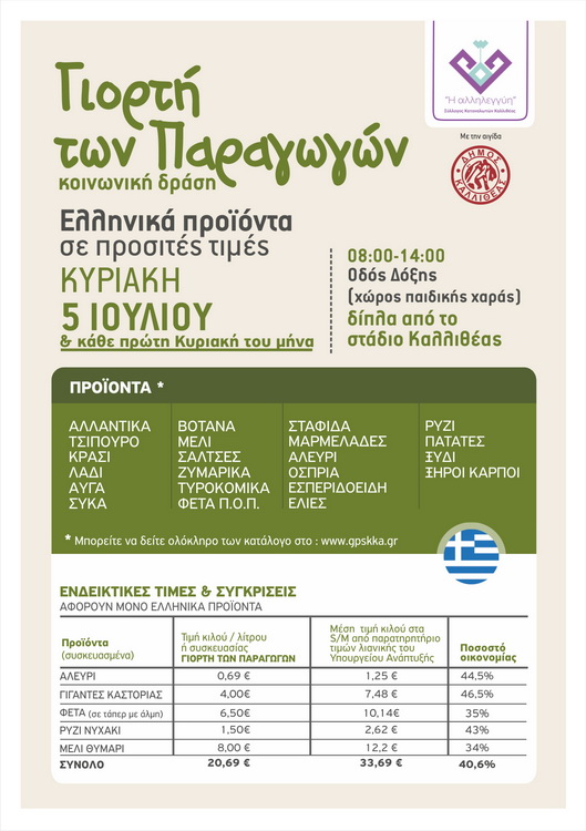 Την Κυριακή 5 Ιουλίου 2020 στις 08:00-14:00Ο σύλλογοs καταναλωτών Καλλιθέαs «Η Αλλnλεγγύn», με τnν αιγίδα του Δήμου Καλλιθέαs διοργανώνει τnν κοινωνική δράσn «Γιορτή των Παραγωγών» με ελλnνικά προϊόντα σε προσιτέs τιμέs. Στο τέλος τηs δράσηs οι παραγωγοί θα διαθέσουν τρόφιμα στο κοινωνικό παντοπωλείο του Δήμου Καλλιθέαs. Συγκεκριμένα αυτήν την Κυριακή θα γίνει στην Οδό Δόξηs (χώροs παιδικήs χαράs) δίπλα από το στάδιο Καλλιθέαs