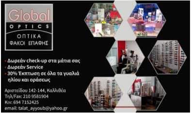 Το Global Optics στην Αριστείδου 142 στη Καλλιθέα, είναι κάτι παραπάνω από ένα κατάστημα οπτικών. Είναι ένα κατάστημα με την μεγαλύτερη γκάμα επώνυμων γνήσιων γυαλιών ηλίου από τις μεγαλύτερες κατασκευάστριες εταιρίες οπτικών, στις καλύτερες τιμές της αγοράς..