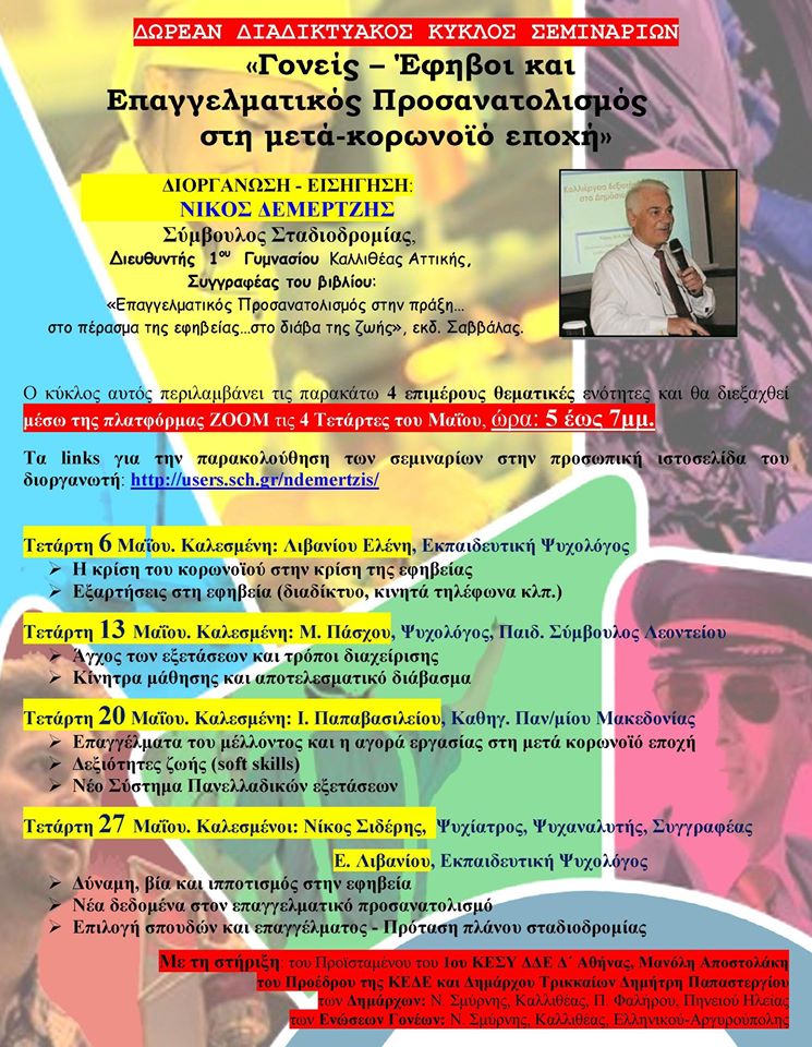 Ο Διευθυντής του 1ου Γυμνάσιου Καλλιθέας Νίκος Δεμερτζής αποδεικνύει συνεχώς ότι η Θέληση καταφέρνει πολλά. Τα σεμινάρια που ήταν να γίνουν τον Μάρτιο ακυρώθηκαν λόγω covid-19, ούτε η ημερίδα που θα γινόταν στο Ευγενίδειο Ιδρυμα ,επομένως τα σεμινάρια που διοργανώνονονται για 18 χρονιά θα διεξαχθούν διαδικτυακά μέσω της πλατφόρμας zoom. O τίτλοε των διαδικτυακών Σεμιναρίων (WEBINAR)