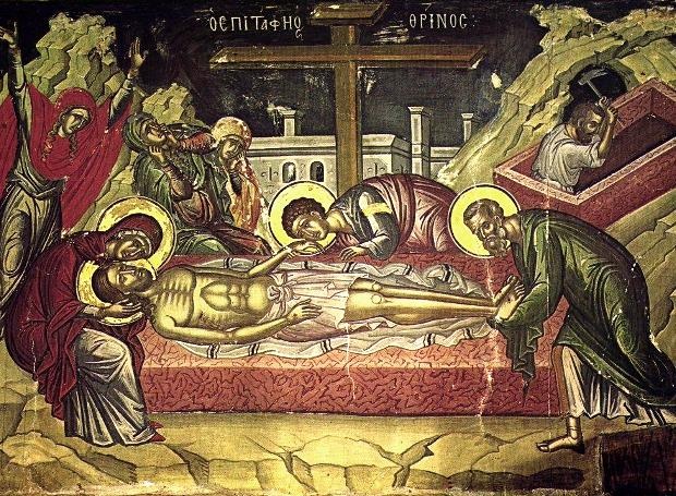 Κατά την δύση του ηλίου, ο Ιωσήφ από Αριμαθείας και ο Νικόδημος -και οι δύο κρυφοί μαθητές του Ιησού- αποκαθηλώνουν το Σώμα, το αρωματίζουν, το τυλίγουν σε καθαρό σεντόνι, το θάβουν σε καινούργιο τάφο και τον σφραγίζουν με μεγάλο λίθο.