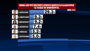 Στην ερώτηση για τον καταλληλότερο πρωθυπουργό, ο Κυριάκος Μητσοτάκης συγκεντρώνει 29,3%, ενώ η επιλογή «κανένας» έρχεται δεύτερη με 25,3%. Ο Νίκος Ανδρουλάκης λαμβάνει 9,3%, με οριακό προβάδισμα μόλις 0,1% έναντι της Ζωής Κωνσταντοπούλου (9,2%).