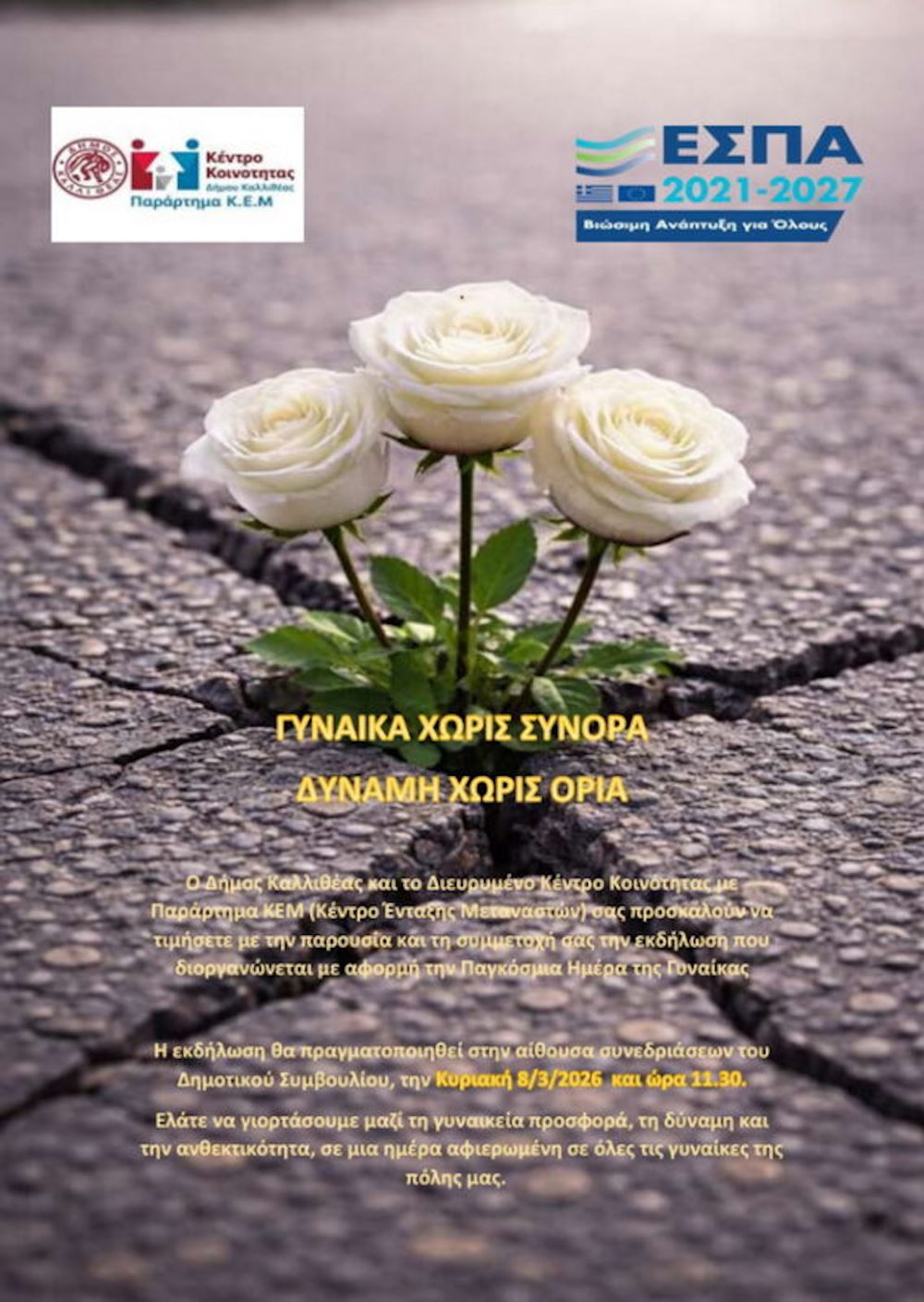 Ο Δήμος Καλλιθέας και το Διευρυμένο Κέντρο Κοινότητας με Παράρτημα ΚΕΜ (Κέντρο Ένταξης Μεταναστών) σας προσκαλούν να τιμήσετε με την παρουσία σας την εκδήλωση που διοργανώνεται με αφορμή την Παγκόσμια Ημέρα της Γυναίκας, την Κυριακή 8 Μαρτίου 2026, στις 11:30 π.μ., στην αίθουσα συνεδριάσεων του Δημοτικού Συμβουλίου Καλλιθέας.